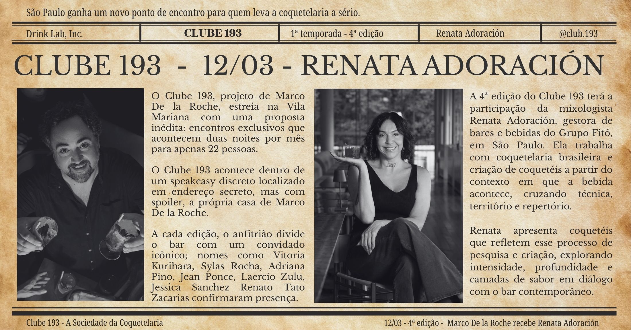 A 3ª edição do Clube 193 Marco De la Roche recebe Renata Adoración, gestora de bares e bebidas do Grupo Fitó, em São Paulo. Ela trabalha com coquetelaria brasileira e criação de coquetéis a partir do contexto em que a bebida acontece, cruzando técnica, território e repertório.