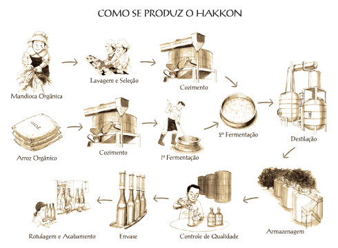 A marca Hakkon mescla a mandioca ao arroz para produzir o primeiro shochu nacional. Com a proposta de ser um produto 100% organico, Hakkon oferece dois tipos de destilados, um com 35% de graduação alcoólica e outro com 25%. É comum encontrarmos shochus com graduação alcoólica mais baixas que outros destilados.