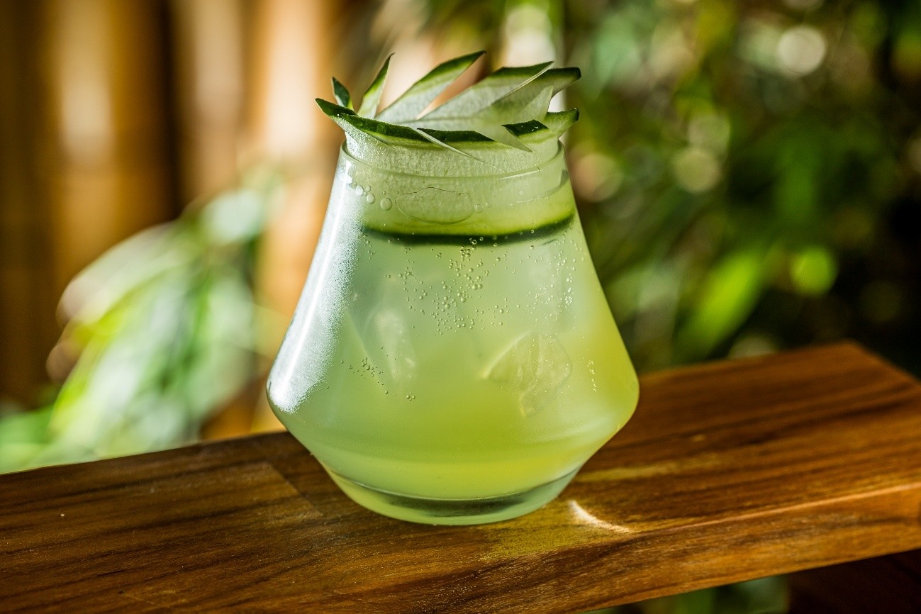 Cambuci, capim-santo, manjericão, limão Tahiti e água com gás — cítrico, verde e vibrante.
